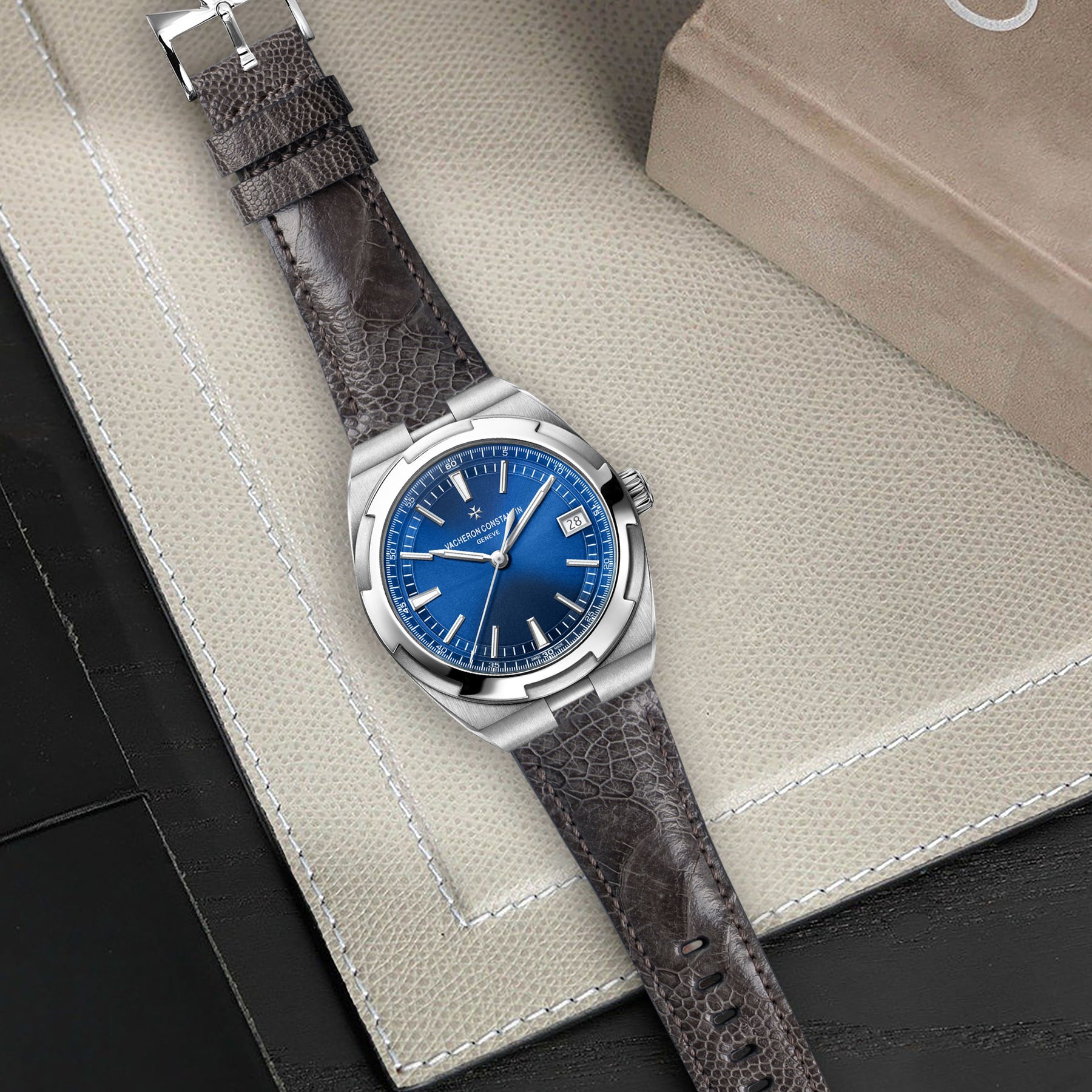 Our straps are specifically made to fit the Vacheron Constantin Overseas VCO 4500V (Self-Winding), VCO 7900V (Dual Time), VCO 4300V (Perpetual Calendar Ultra-Thin), VCO 5500V (Chronograph), VCO 6000V (Tourbillon), VCO 7700V (World-Time) with the special metal insert for the interchangeable strap system, you can easily switch in seconds without tools. While the OEM bracelet and rubber strap that comes with the watch are good, there are times when you just prefer to have a Ostrich Leg strap on for a different look.