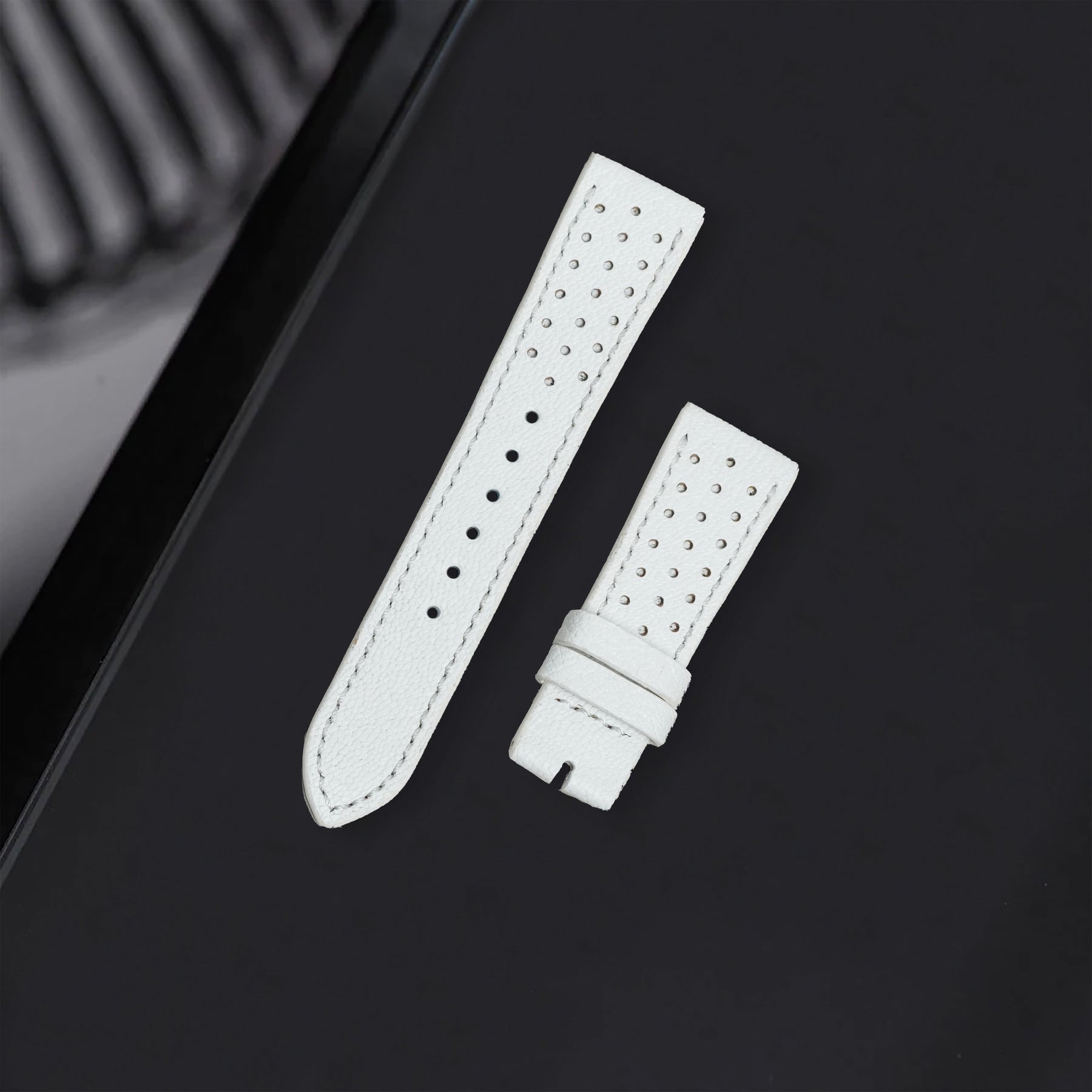 Description : Inspired by the sporty times of the 70’s, these racing straps are an essential to make any sport watch look even cooler. The holes make the strap lighter and more breathable, ideal for warm conditions where you want the comfy feel of a leather strap but don’t want the whole leather feel.