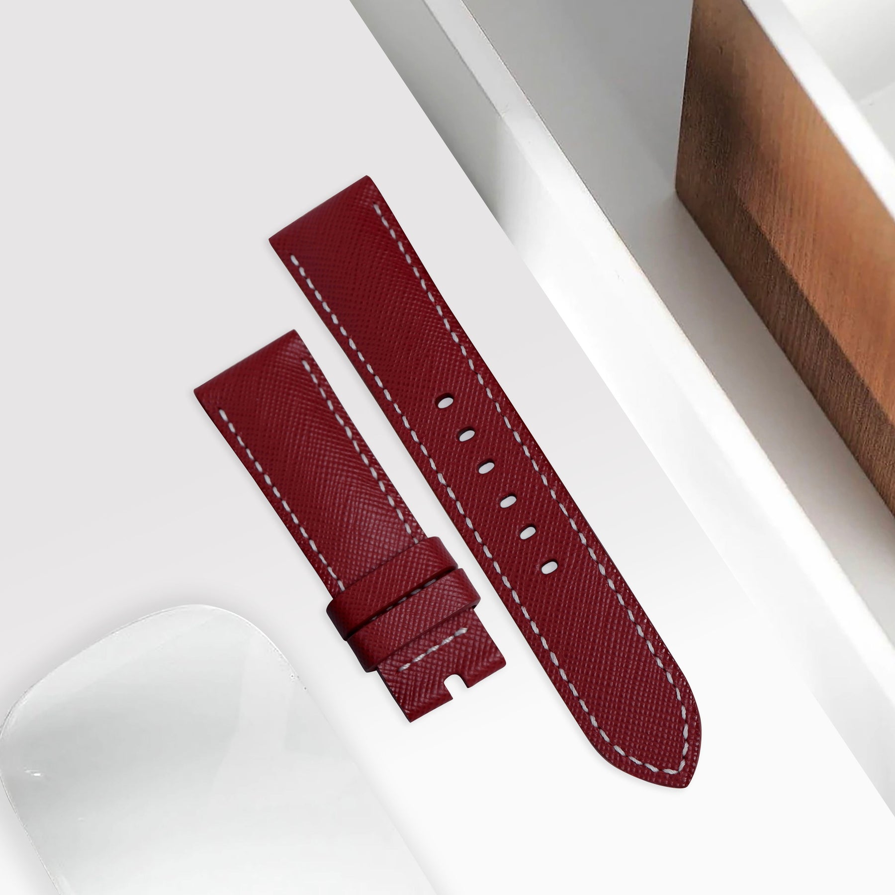 Our Maroon Saffiano is the one strap for all your needs. The watch strap deals well with water, scratches and is also easy to care for and can be cleaned with a simple wipe using a damp cloth.