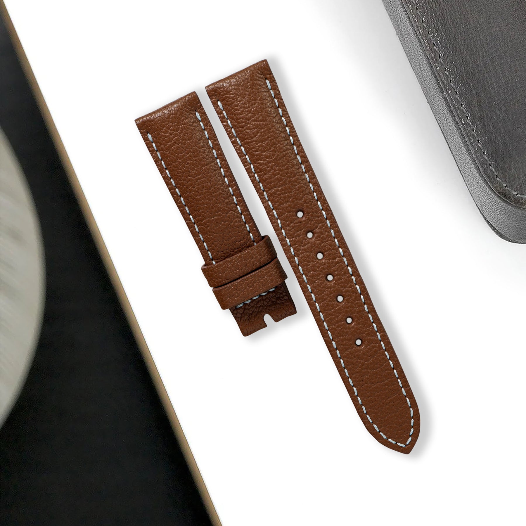 Chevre is immediately recognisable from its texture and grain. A smooth surface and a slight gloss immediately imparts luxuriousness to products made with this leather. Not only a feast for the eyes, chevre is also strongly water and scratch-resistant, and is a great option for daily wear watch straps.