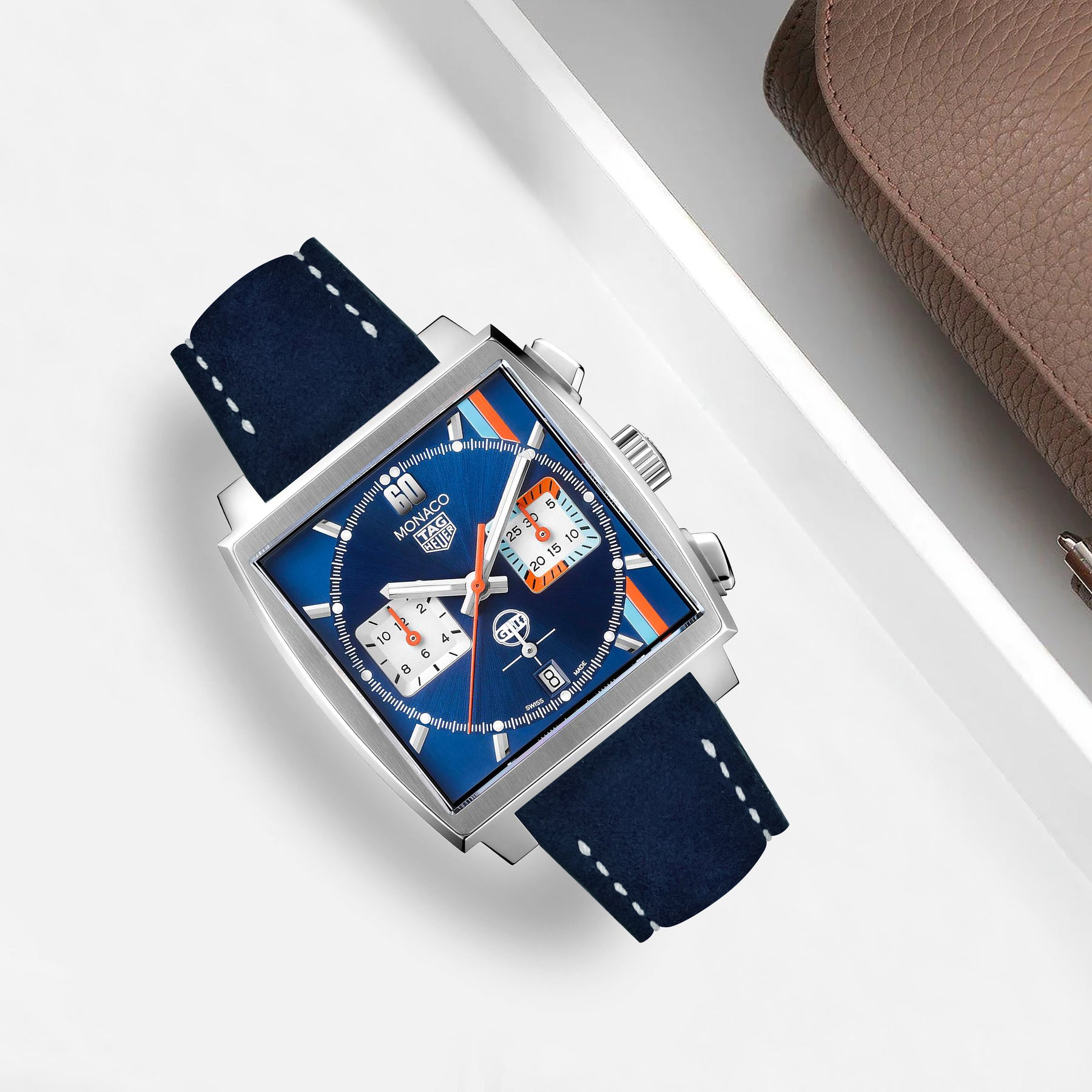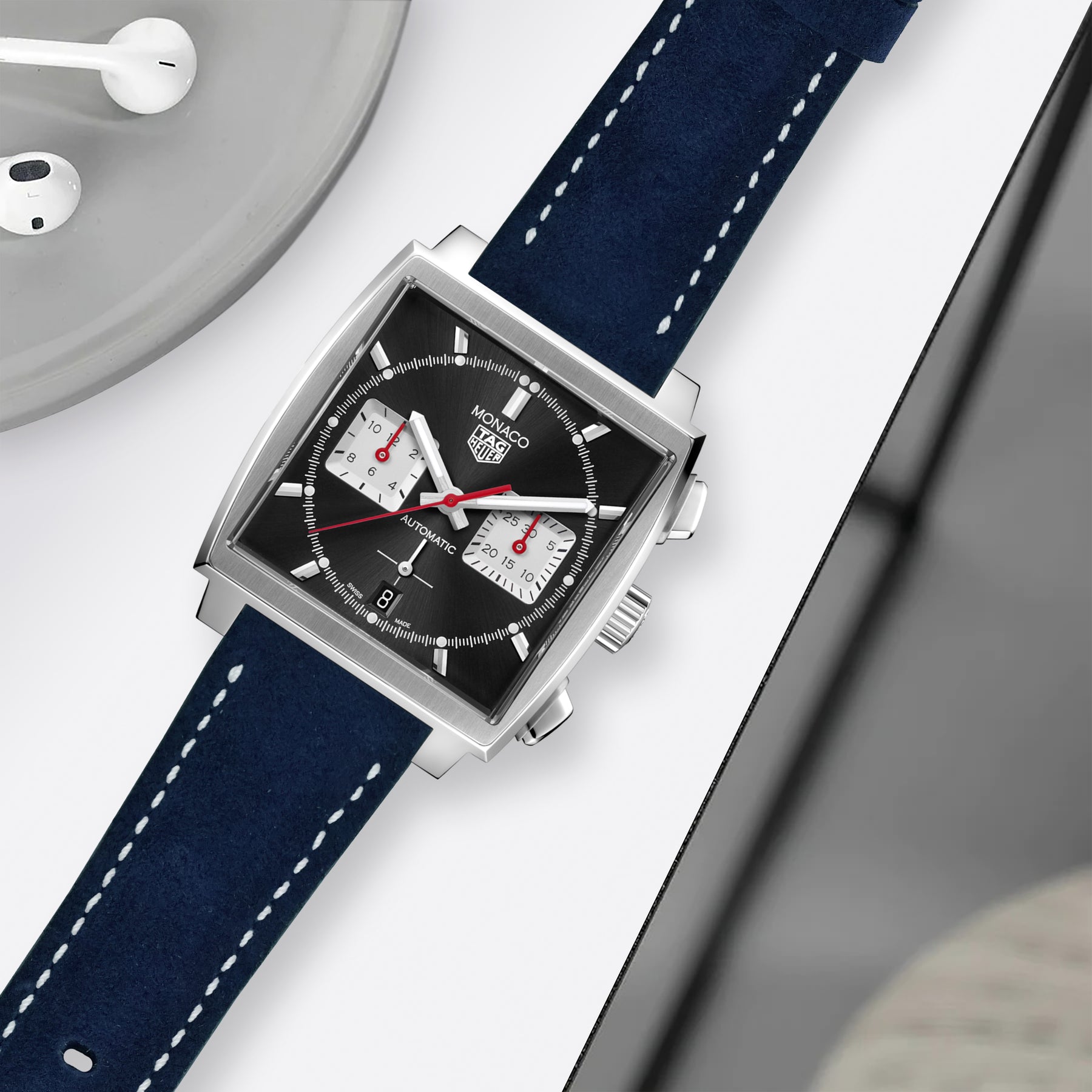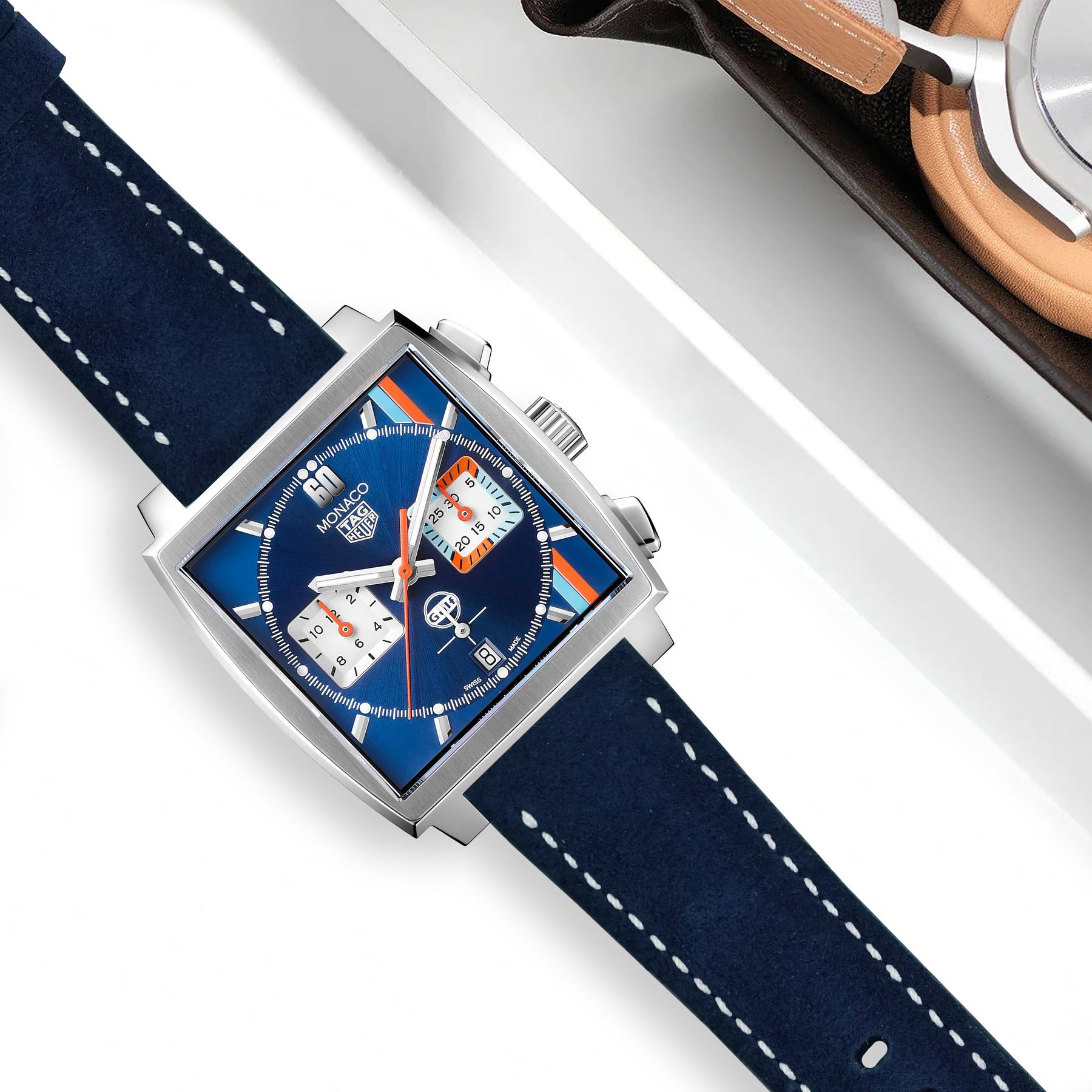 Tag Heuer Monaco Straps - Suede Navy Blue White Stitch