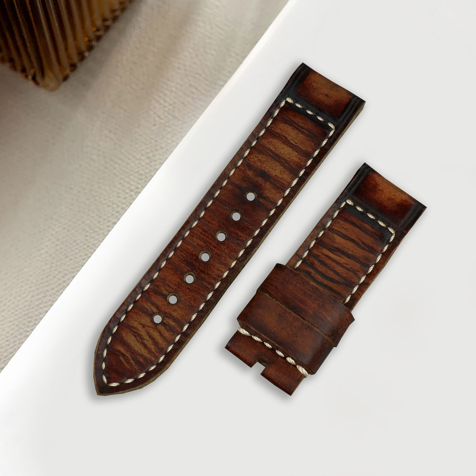 Several lacquers are then added by hand to achieve an antiquated patina, meaning each strap will be unique in character and will age wonderfully with wear.