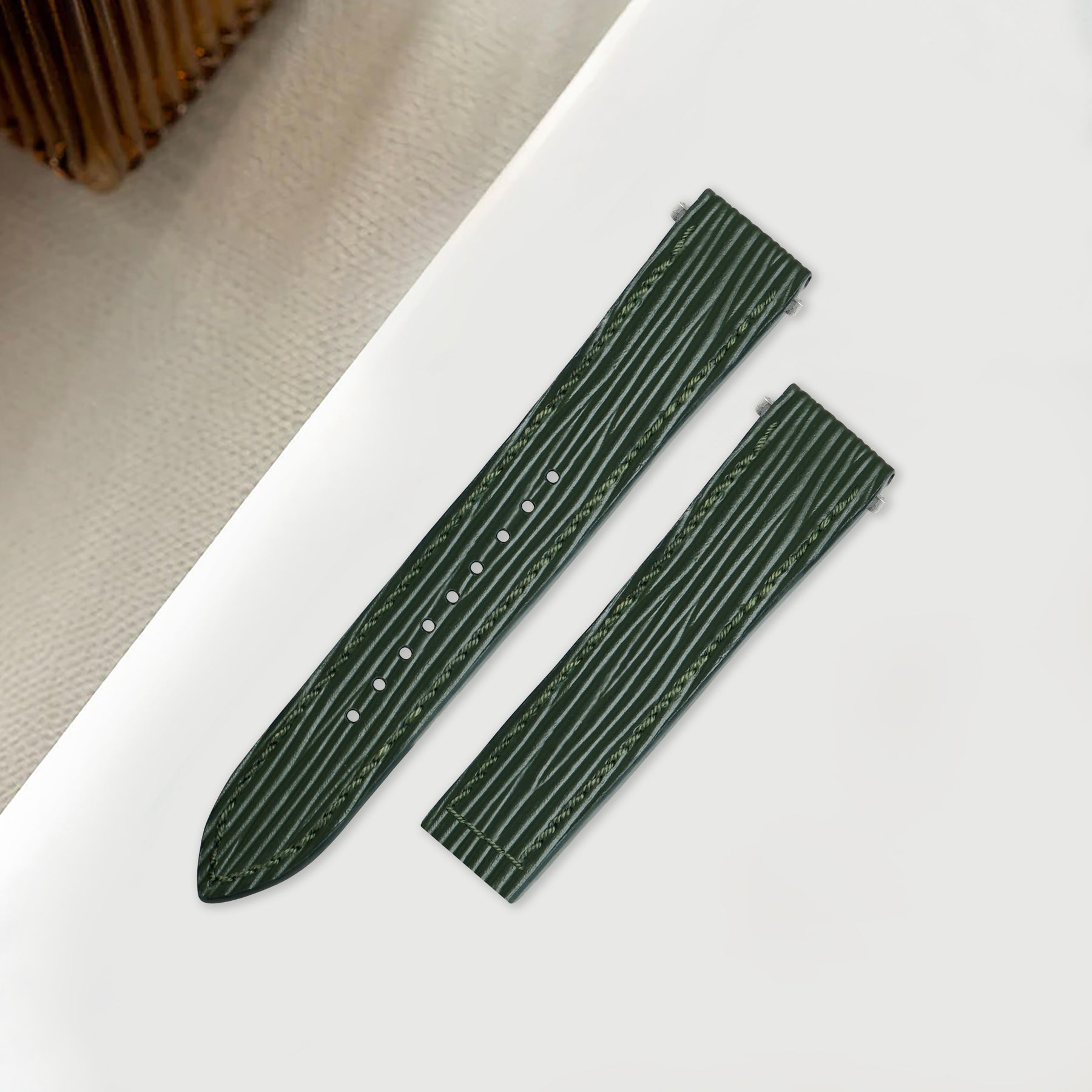 Material : European Calfskin leather with a horizontal textured pattern stamped on the surface and finished with a waterproof finish. For exceptional all-day comfort, and durability, our watch straps are lined with hypoallergenic calf leather which prolongs the life of our straps by creating a barrier between the leather of the strap and your skin.