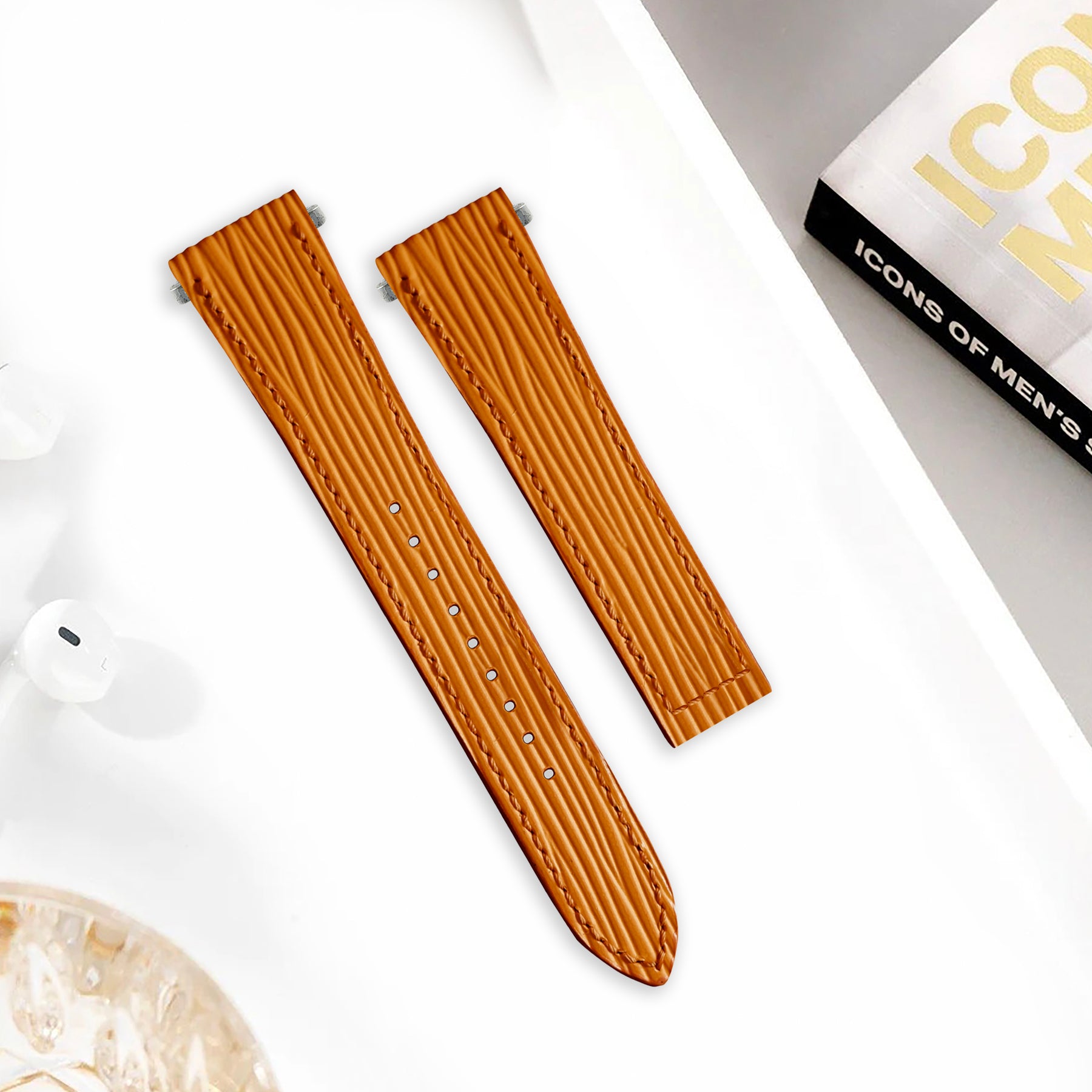 Material : European Calfskin leather with a horizontal textured pattern stamped on the surface and finished with a waterproof finish. For exceptional all-day comfort, and durability, our watch straps are lined with hypoallergenic calf leather which prolongs the life of our straps by creating a barrier between the leather of the strap and your skin.