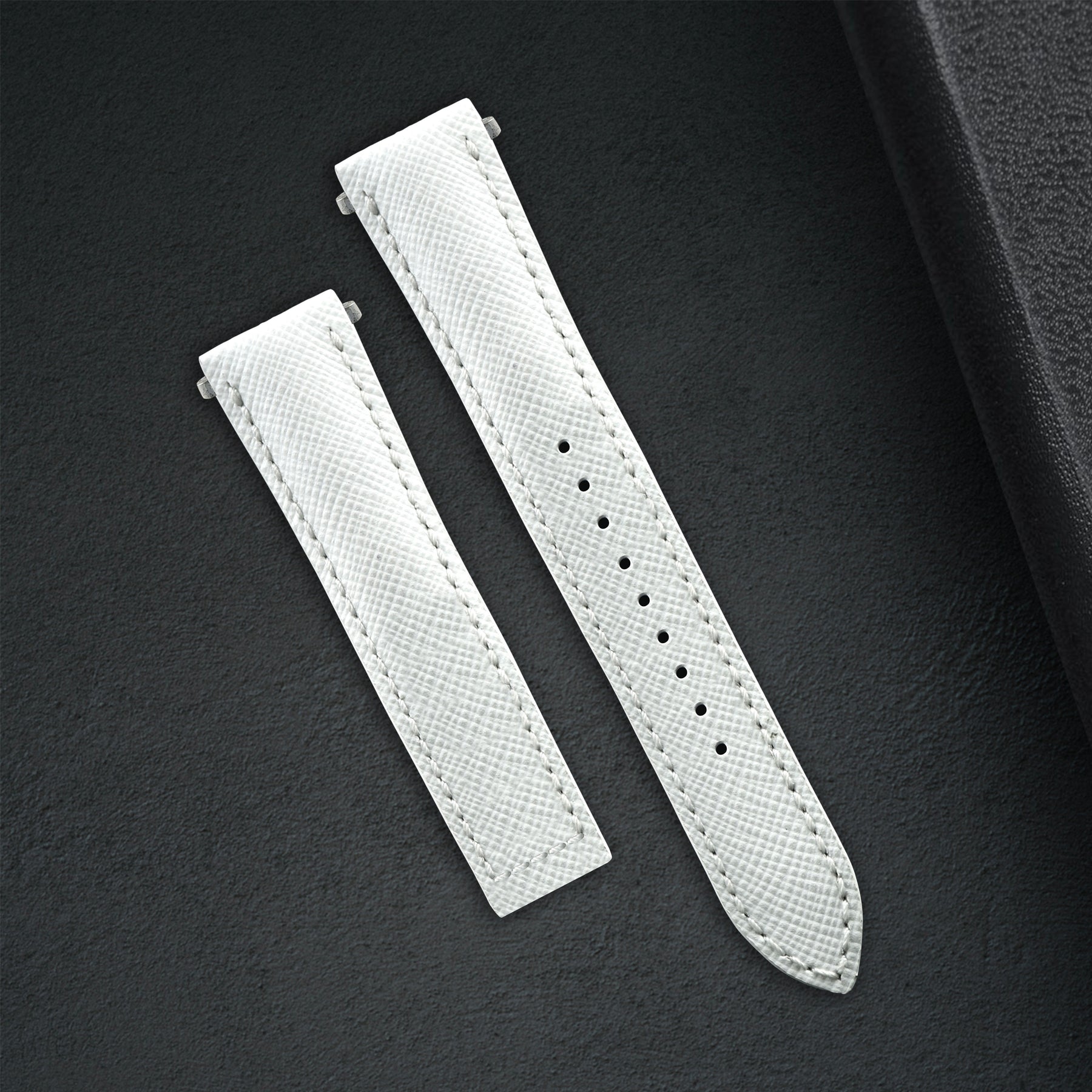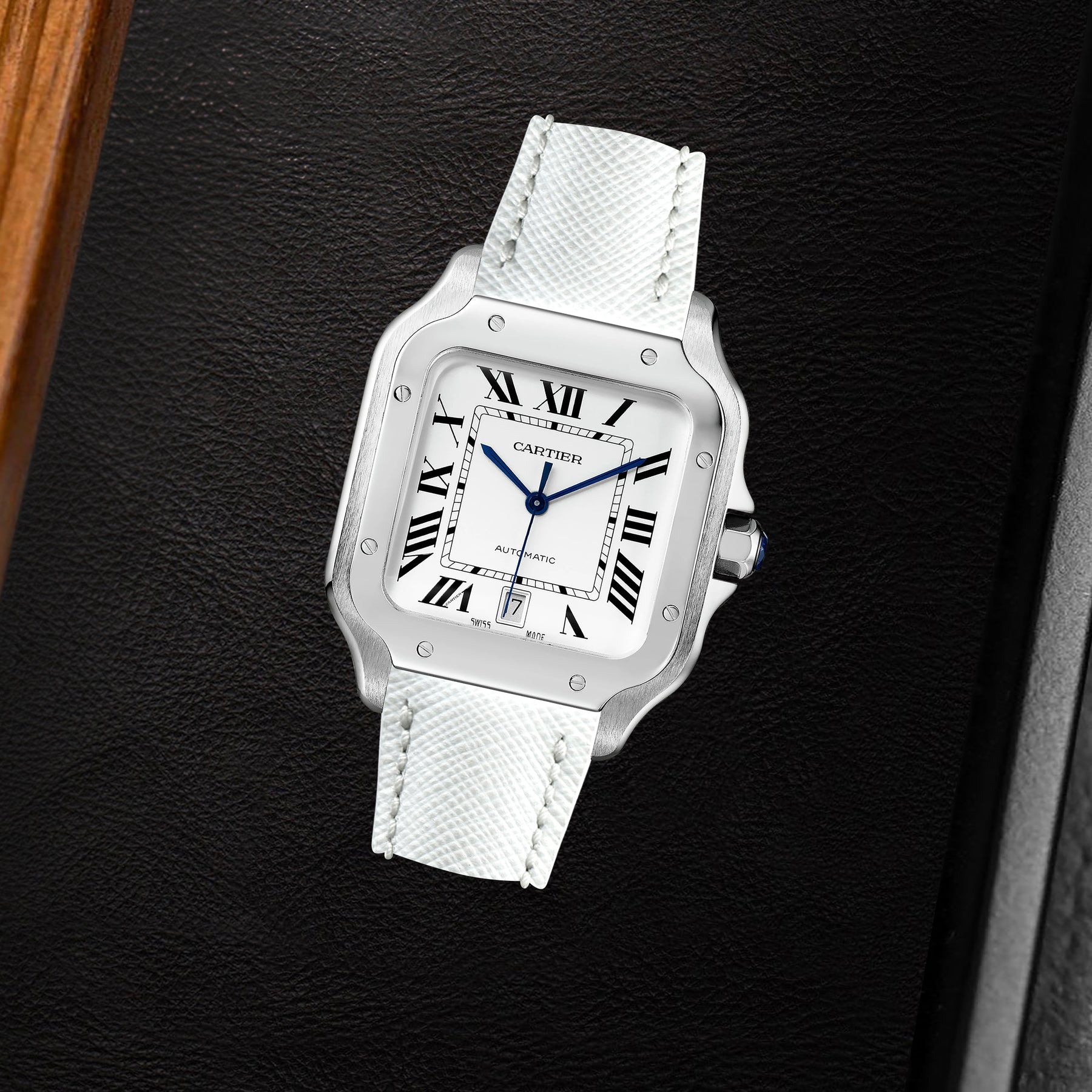 Our White Saffiano is the one strap for all your needs. The watch strap deals well with water, scratches and is also easy to care for and can be cleaned with a simple wipe using a damp cloth. It looks fantastic on Santos de Cartier and is so easy to pair with your daily outfits.