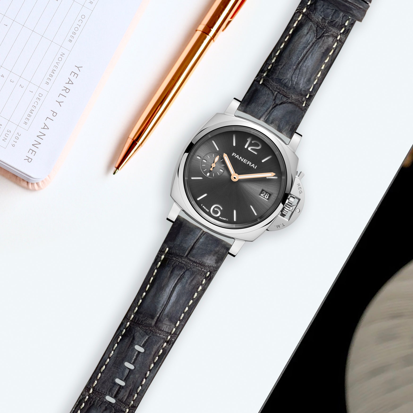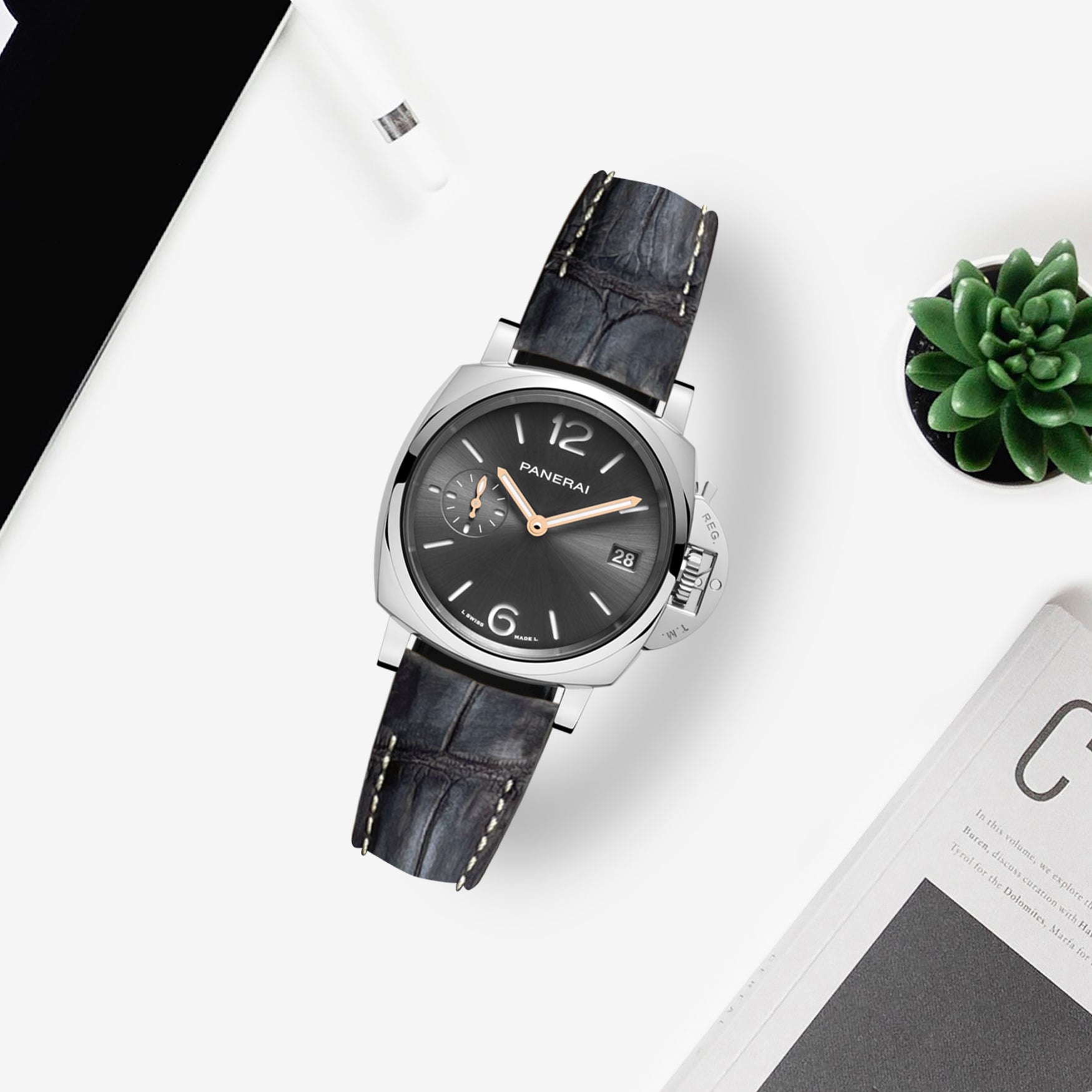 Our Newly arrived Croco Nubuck is a really great colour that will work really well on Luminor Due. Classy Croco leather strap with a fine nubuck texture that’s been finished with a very special coloring technique. Features with simple pressure applied on the button on the back of the strap near the attachment, it’s easy to hook and release the strap from the case.