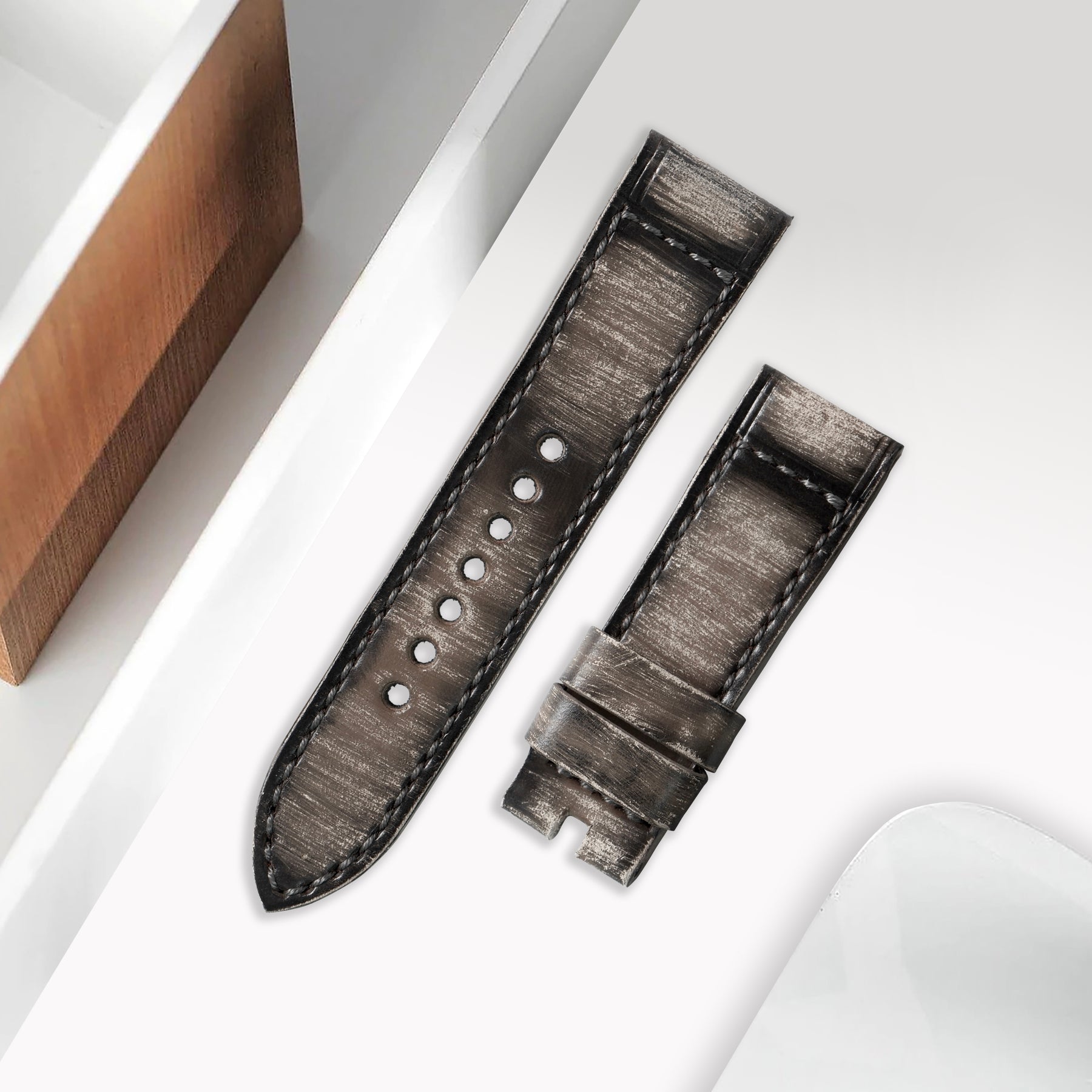 Provides a wonderful depth of color. It's rich grey leather has a roughed up finish that adds a ton of character, yet it remains smooth and supple when worn. It accentuates your beautiful watches with a rugged look and somehow only adds to their style.