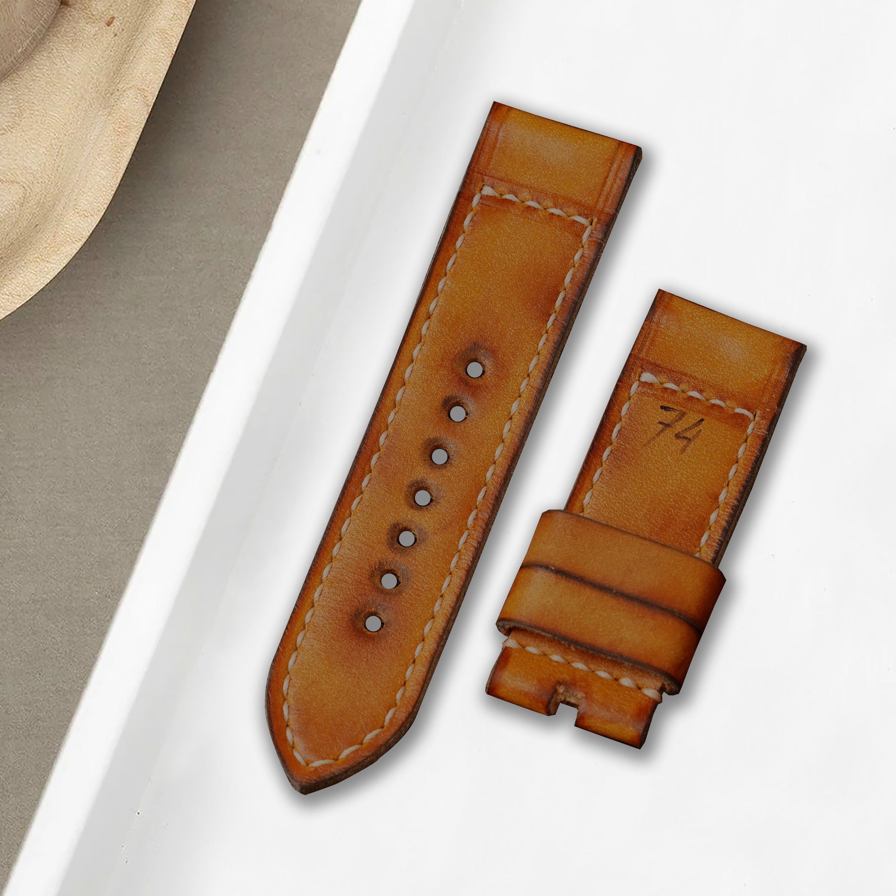 If you have a look through the Panerai Catalogue, the larger one, you will see a photo of a vintage 8-day Angelus Panerai wearing a Vintage strap with "74" marked on it. This will definitely lead to a nice wear and scrappy look to the strap over some time which will only enhance the overall look of this gorgeous strap. A really nice strap to set your watch apart from others, even if it’s not a Panerai!