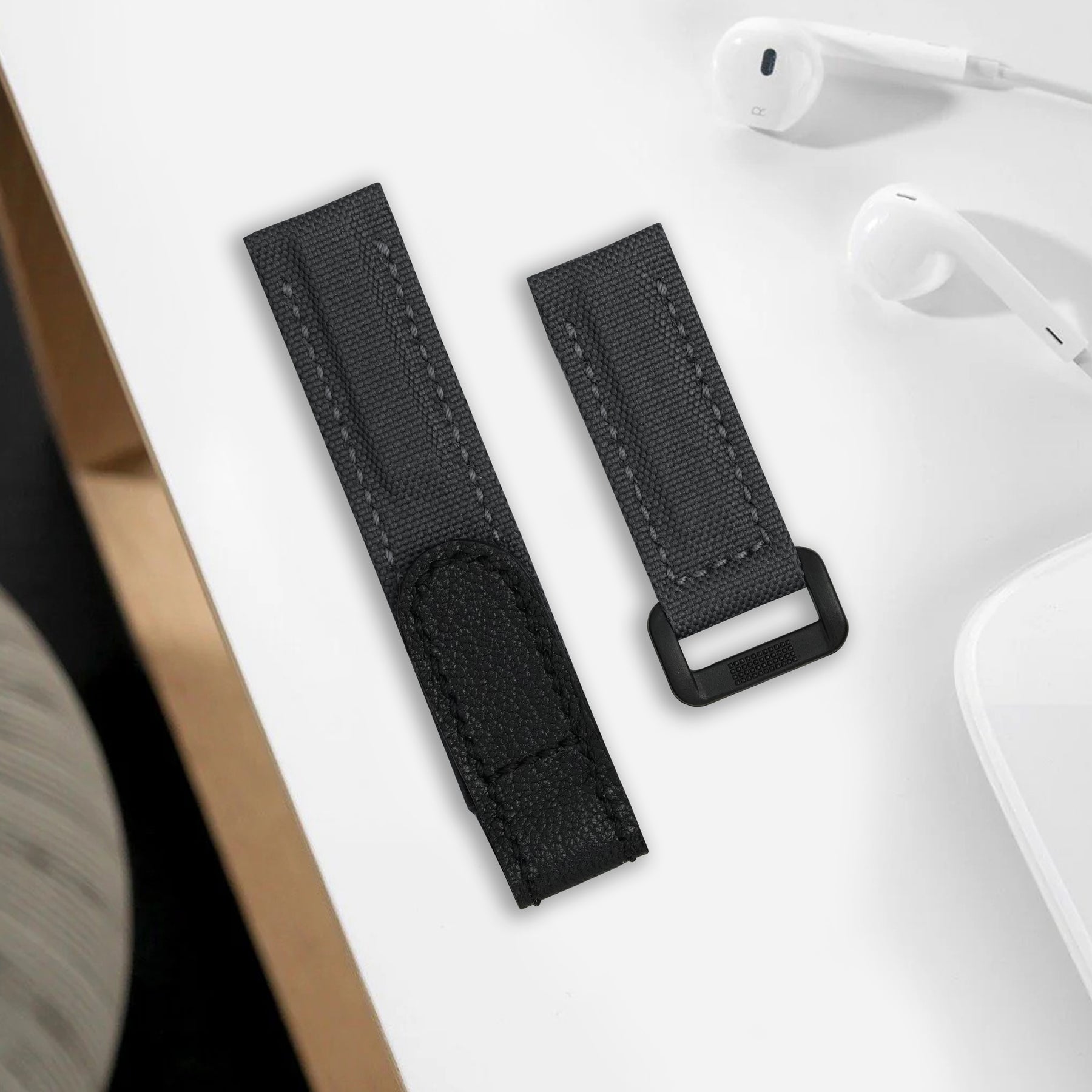 Material : Double-layered, stitched, durable Canvas leather strap in Grey with an adjustable hook and loop velcro closure in Calf leather Black. Also the soft hypoallergenic leather lining for exceptional all-day comfort, and durability.