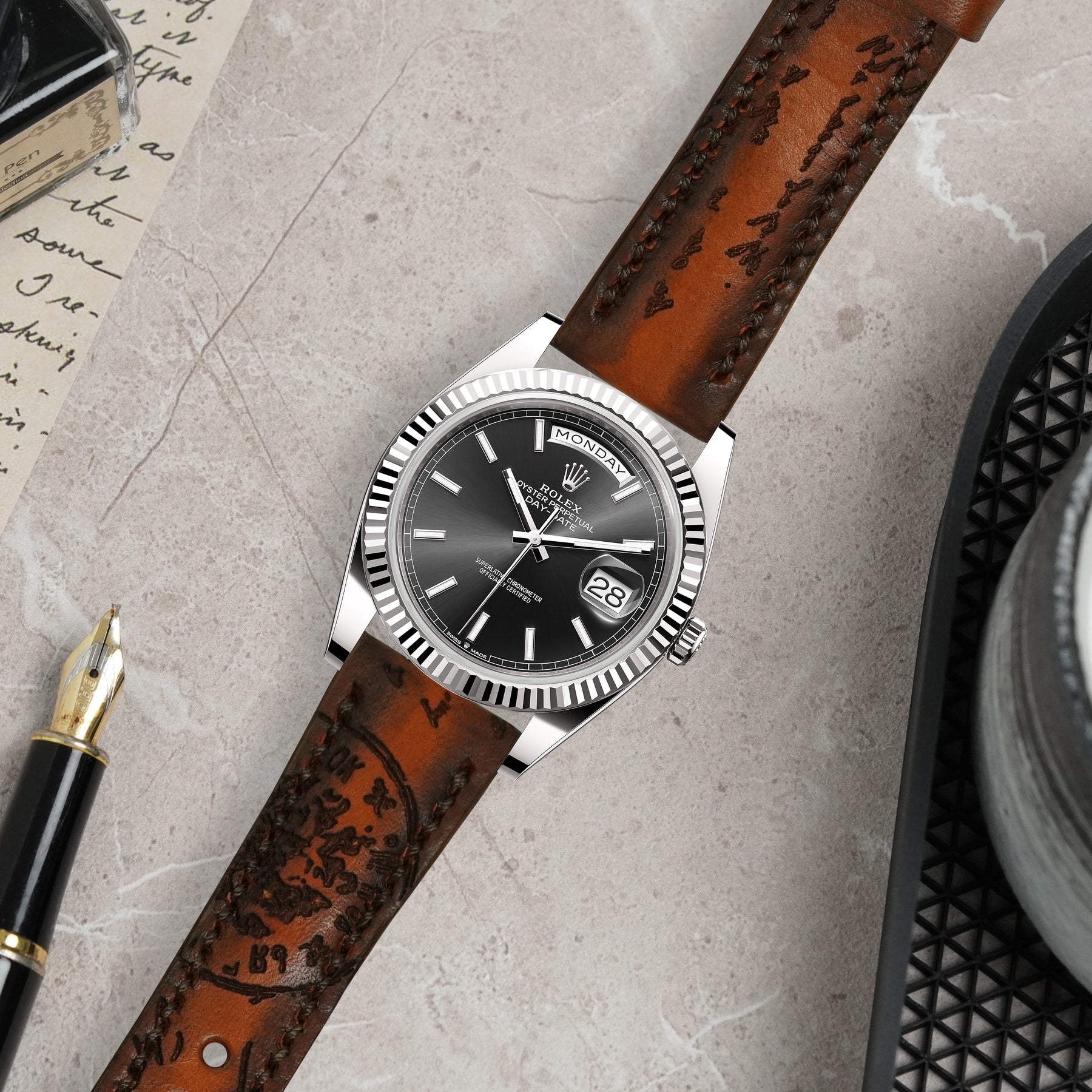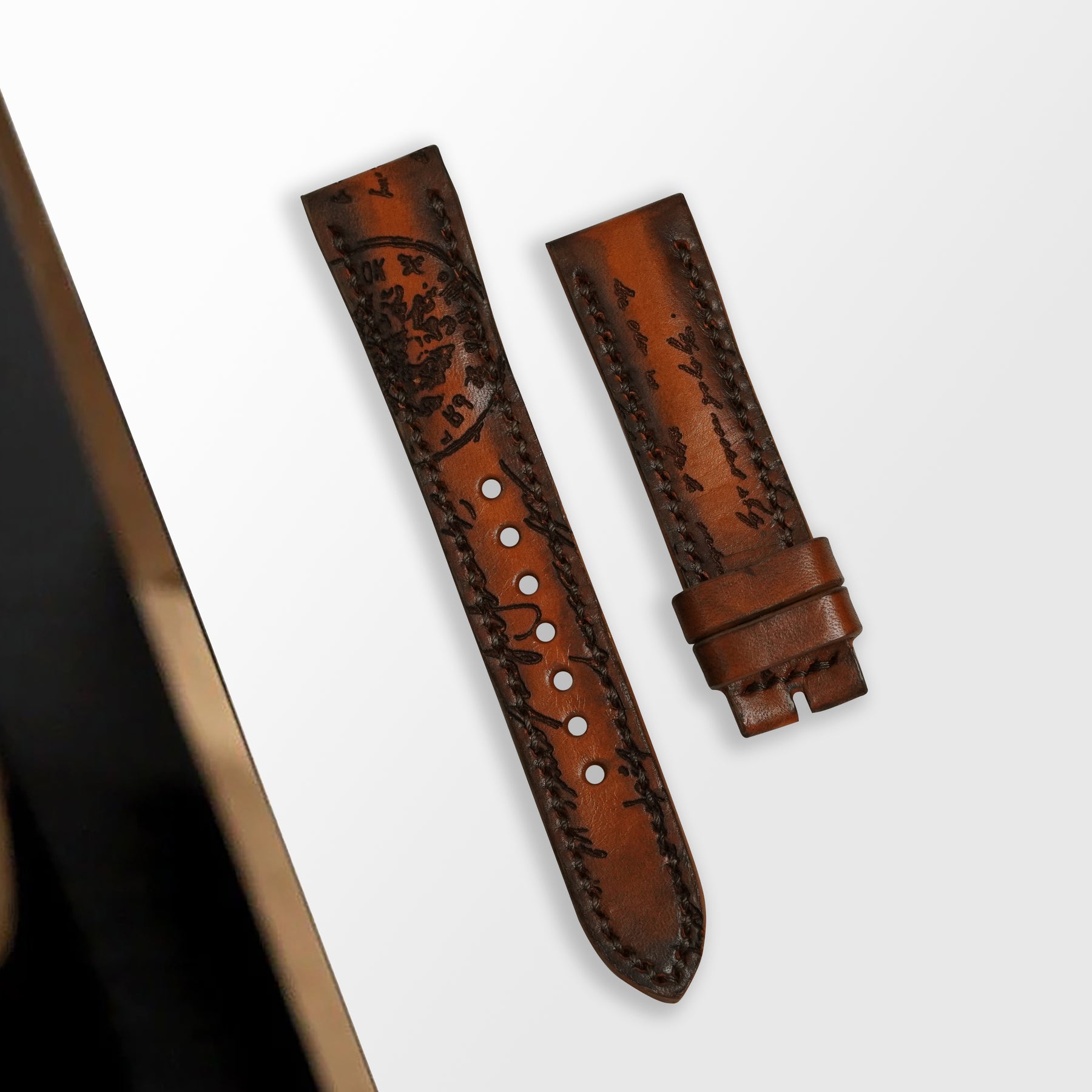 The artful combination of the fashion and the watch straps exemplified elegance, defining the spirit of the classic gentleman. Features a technique that involves engraving text into the calf leather, inspired by 18th century calligraphy. The leather is treated by hand to create unique patina, or palette of colours based on essential oils and pigments making sure this elegant strap will be on your wrist forever.