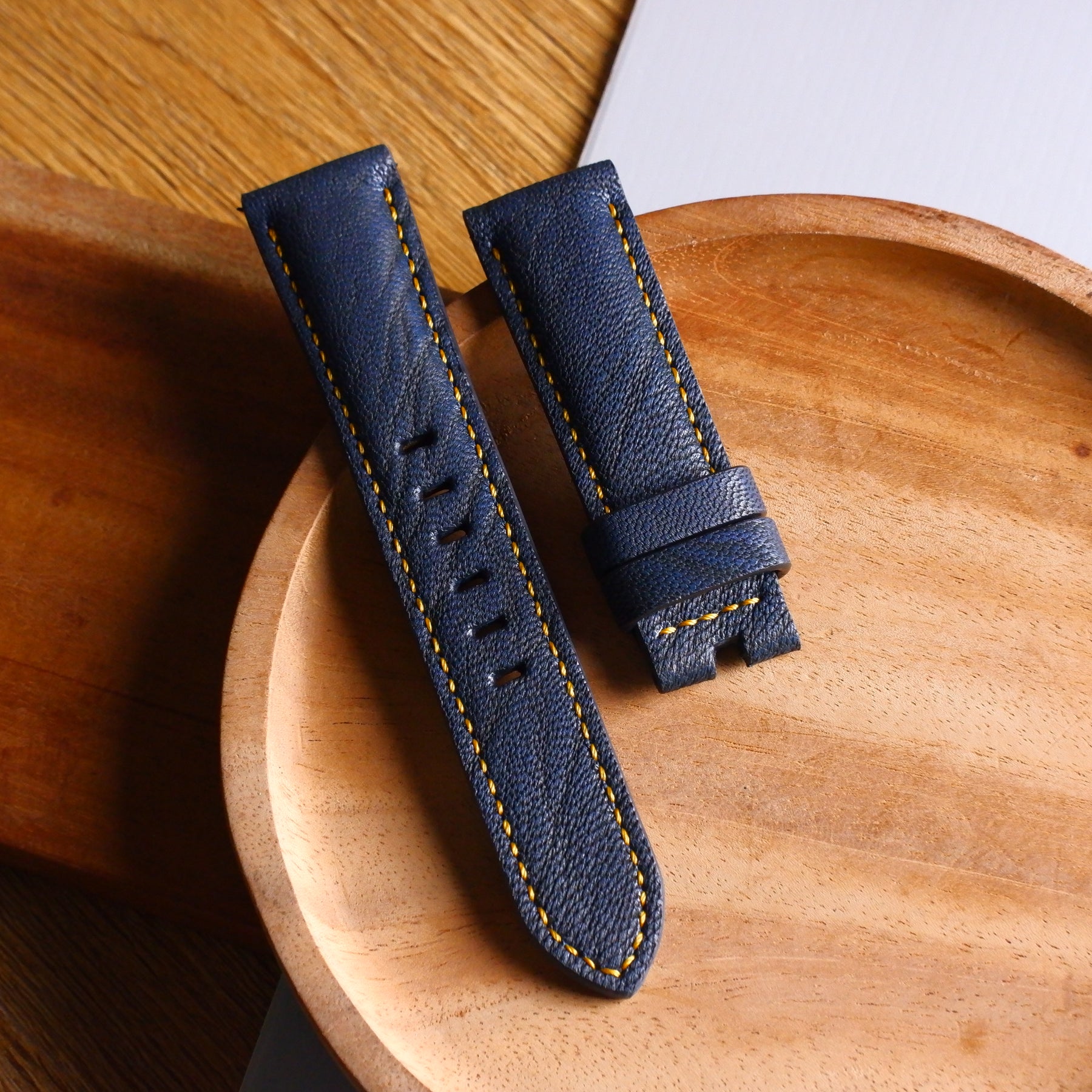Stitching : Each stitching hole is punched by antique awl and hand stitched with patina wax yarn. (you can choose any other color combination/stitching to make a truly custom strap).