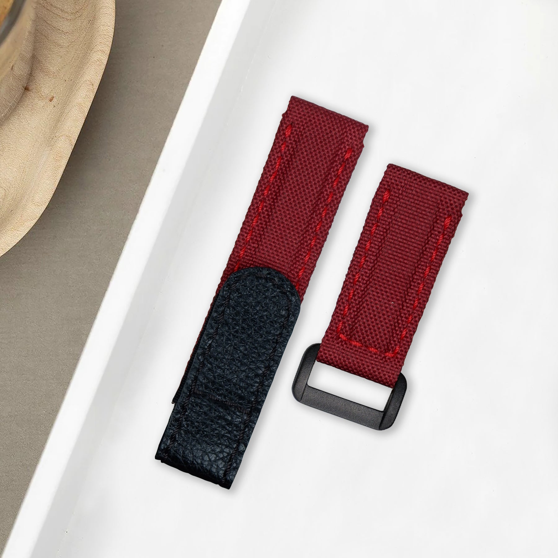 Material : Double-layered, stitched, durable Canvas leather strap in Maroon with an adjustable hook and loop velcro closure in Calf leather Black. Also the soft hypoallergenic leather lining for exceptional all-day comfort, and durability.