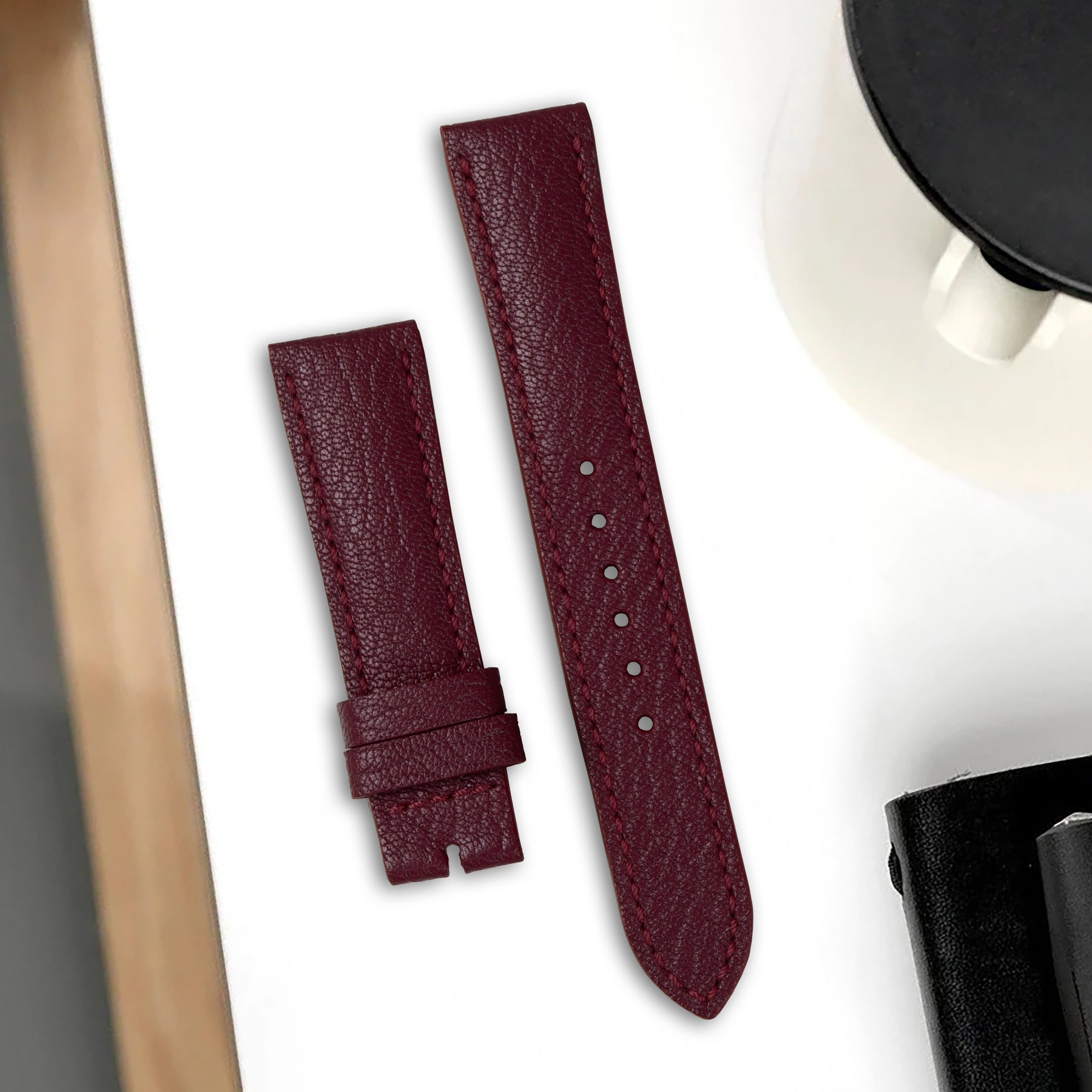Chevre is immediately recognisable from its texture and grain. A smooth surface and a slight gloss immediately imparts luxuriousness to products made with this leather. Not only a feast for the eyes, chevre is also strongly water and scratch-resistant, and is a great option for daily wear watch straps.