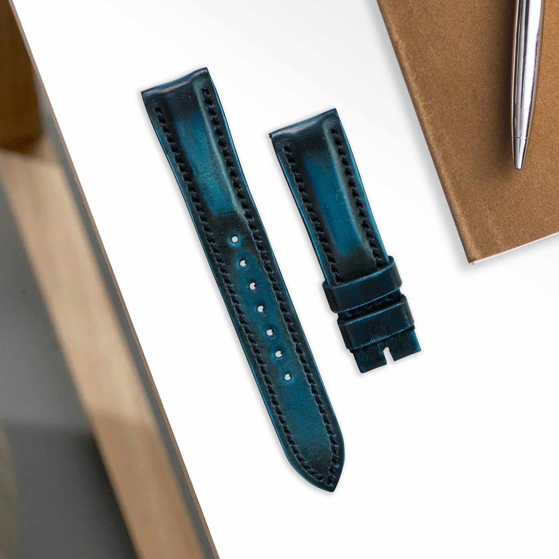 Description : The Wraith Serie is a strap unique to each individual wearer. The Black wax on the leather will work it way through forming patina and revealing the Blue over time.