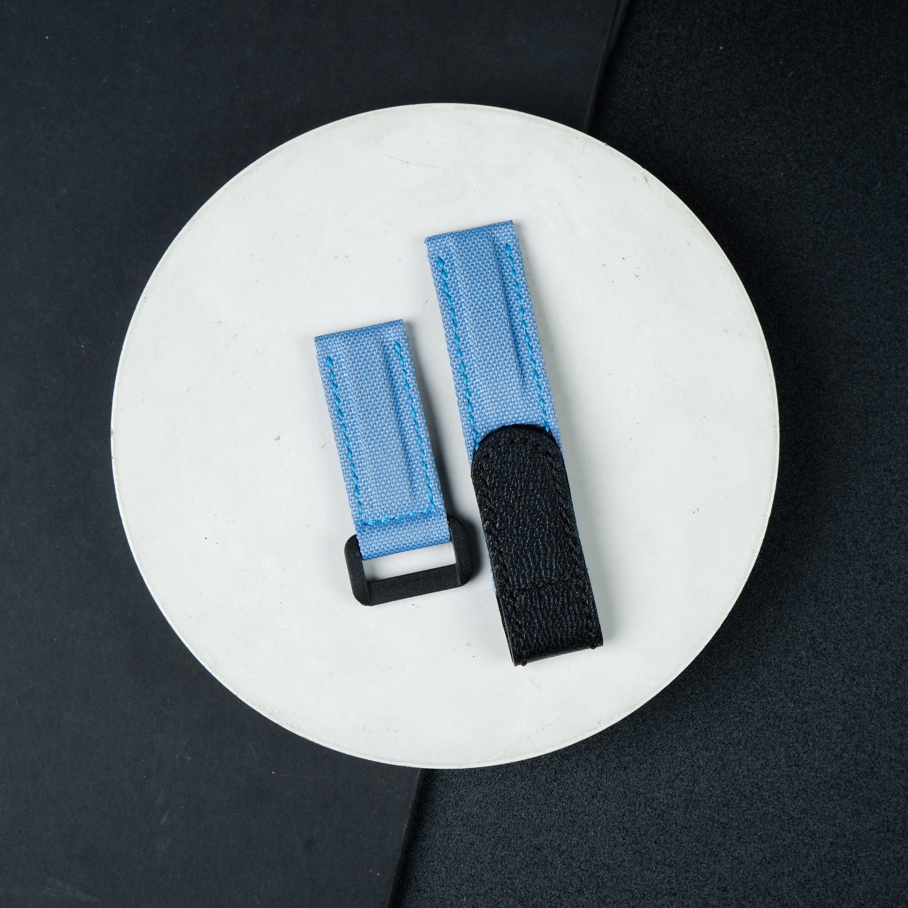 Material : Double-layered, stitched, durable Canvas leather strap in Blue with an adjustable hook and loop velcro closure in Calf leather Black. Also the soft hypoallergenic leather lining for exceptional all-day comfort, and durability.