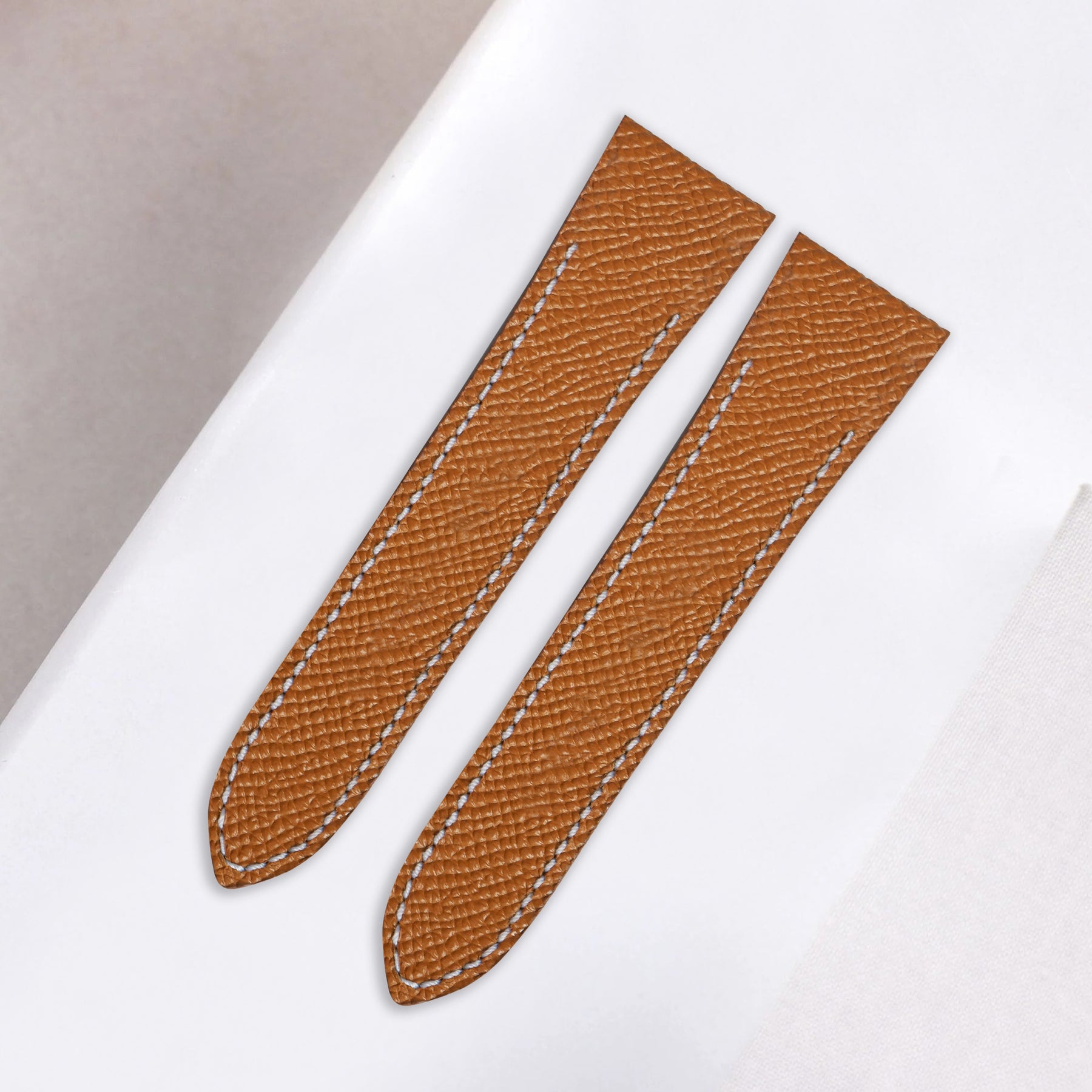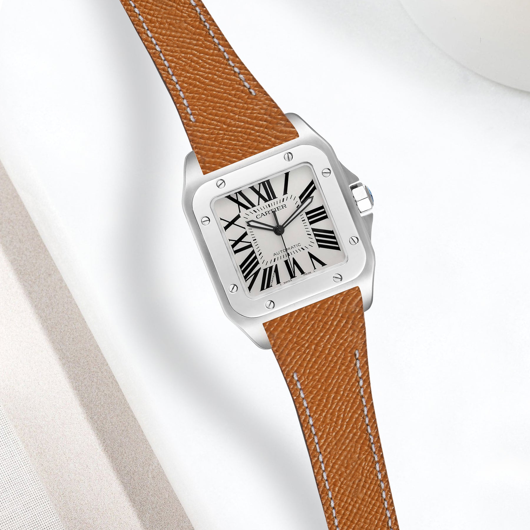 If you want a strap that has a beautiful texture, good scratch and water resistance with a wide range of colours to match your outfit or personality, the Epsom Serie is perfect for you. The versatility of an Epsom leather strap is something truly special, it is soft and contours the wrist well from day one. Each strap designed specifically to fit the OEM Cartier Santos 100 deployant clasp.