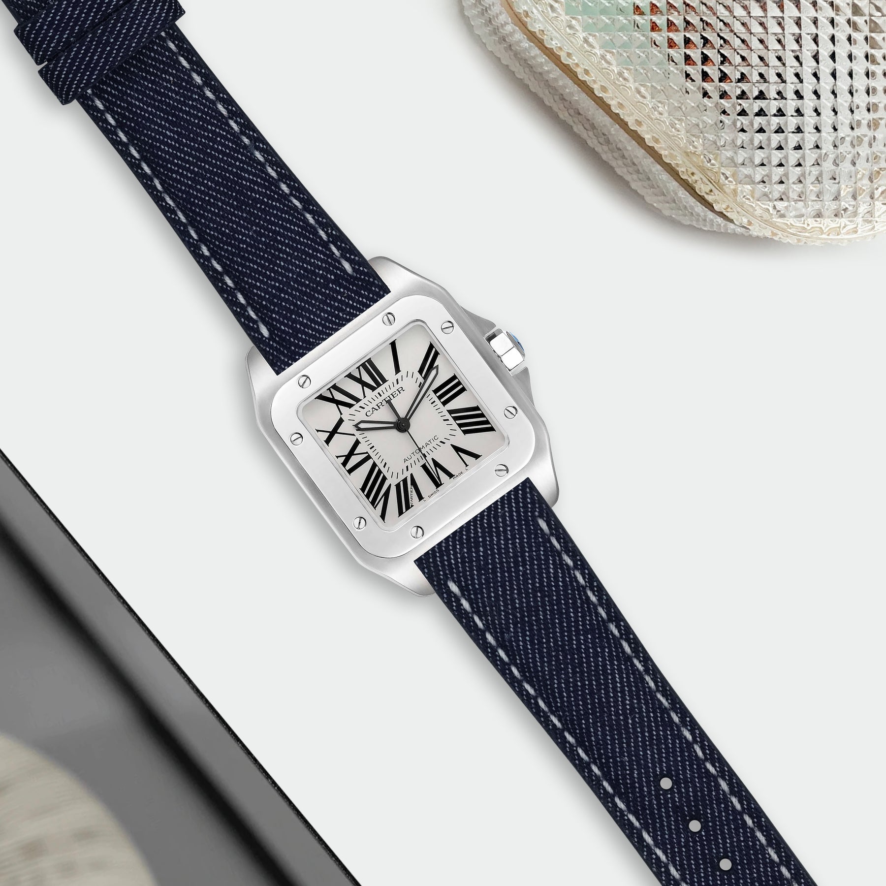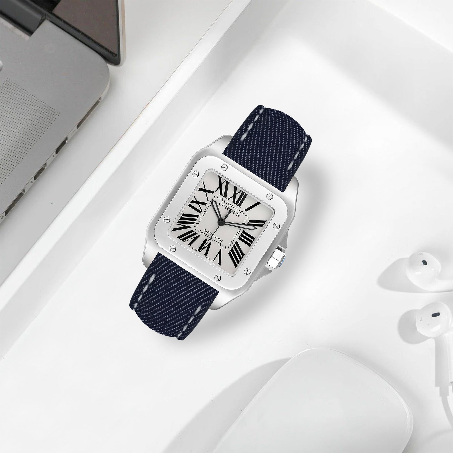 Description : Upgrade your Cartier Santos 100 with a perfectly fitting custom strap, combining versatility, quality, and classic appeal for a refined and polished look. Now, you can take advantage of all the leather options such like Denim Selvedge strap, offering a perfect balance of elegance and comfort. Guaranteed to fit both Cartier Santos 100 Medium (20mm), XL Classic (23mm) and XL Chronograph (24mm) models.