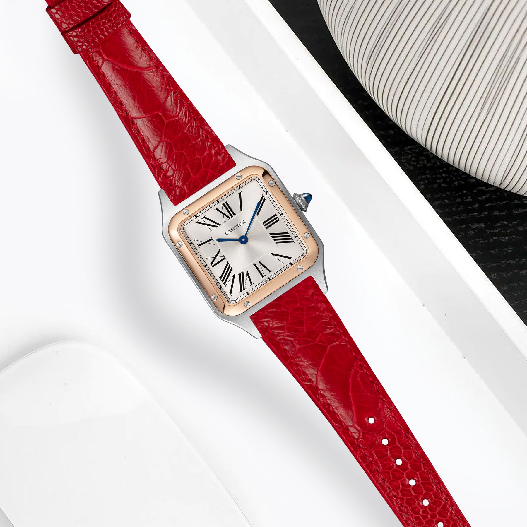 Description : Introducing the new addition to the Cartier Santos-Dumont collection. Genuine Ostrich Leg watch strap designed exclusively for Santos Dumont feature Quick-switch system using the same metal adapters and comes with a quick release spring bar to provide a flush fit for the Cartier Santos-Dumont without any lug overhang. Unlike the Santos line-up, this collection was made to only fit straps, not bracelets. With its slim case and classy look, it was a very dressy watch that worked well on a range of straps.