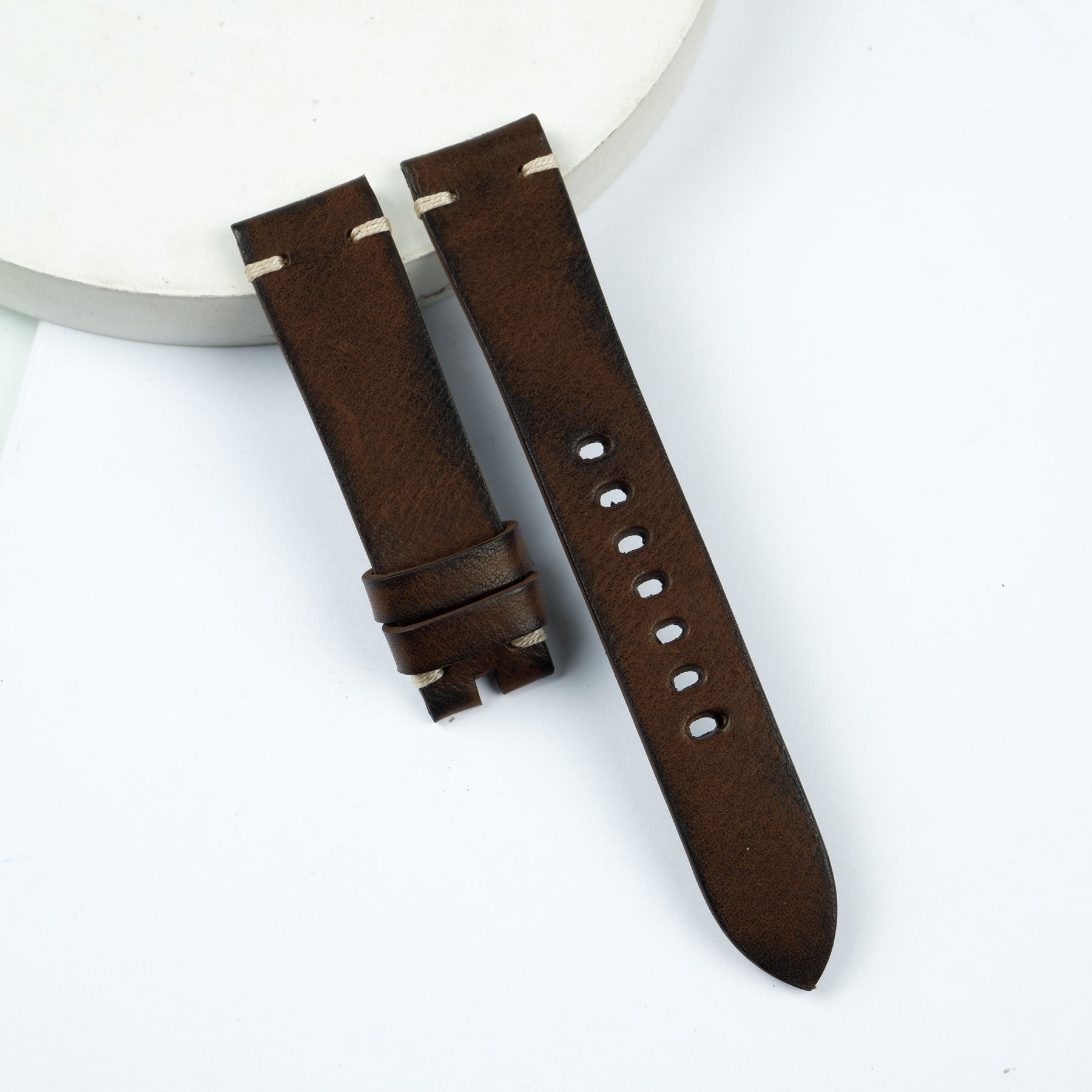 Material : From the vegetable tanning to the splitting, in hours and hours of traditional work. This process will be repeated until the color saturation is ideal. The final step is detailing the straps with additional dye which gives you a strap unique in its own way.