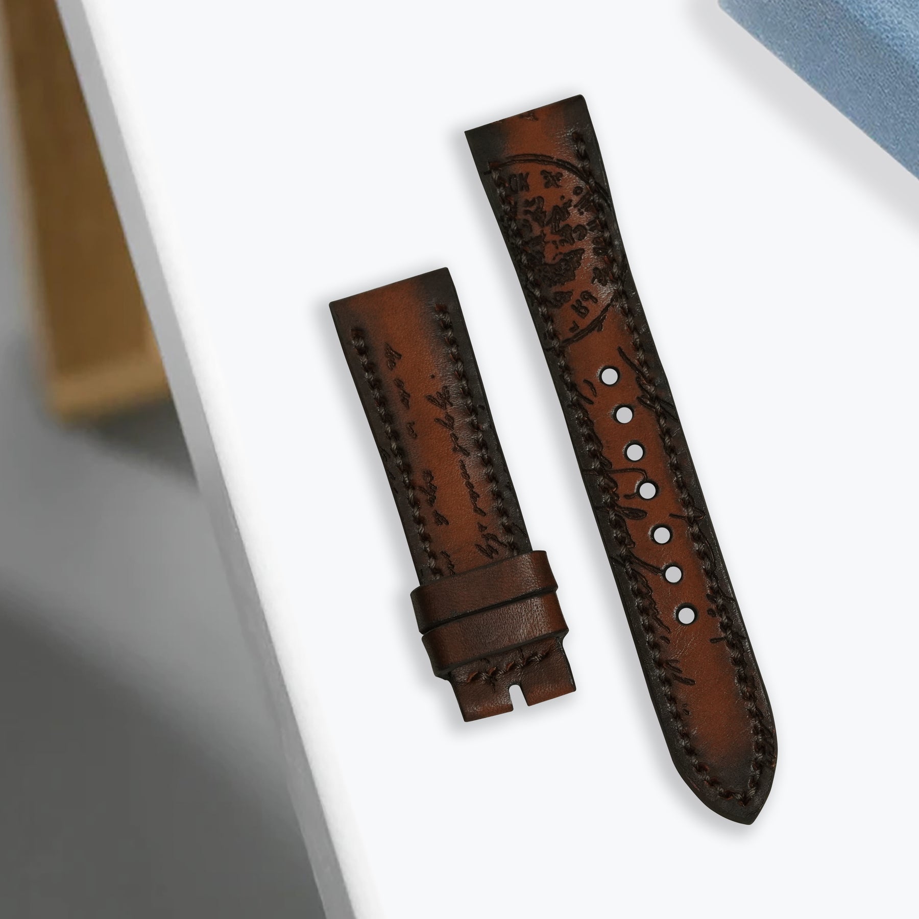 The artful combination of the fashion and the watch straps exemplified elegance, defining the spirit of the classic gentleman. Features a technique that involves engraving text into the calf leather, inspired by 18th century calligraphy. The leather is treated by hand to create unique patina, or palette of colours based on essential oils and pigments making sure this elegant strap will be on your wrist forever.