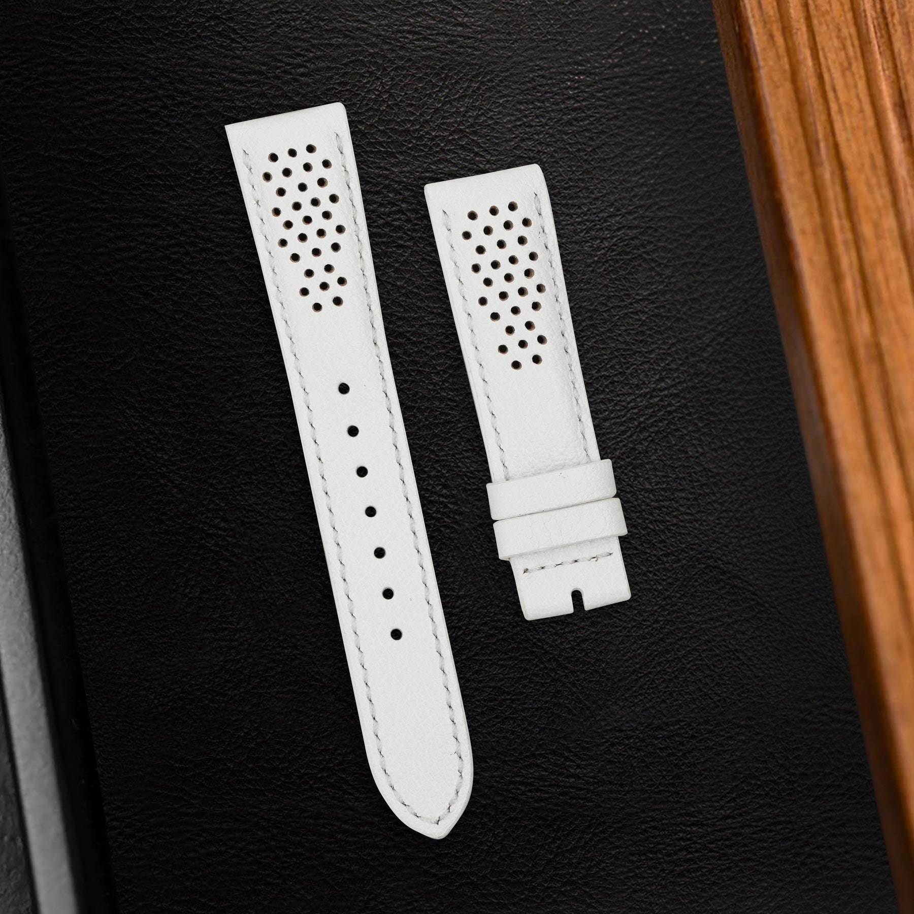 Description : Inspired by the sporty times of the 70’s, these racing straps are an essential to make any sport watch look even cooler. The holes make the strap lighter and more breathable, ideal for warm conditions where you want the comfy feel of a leather strap but don’t want the whole leather feel.